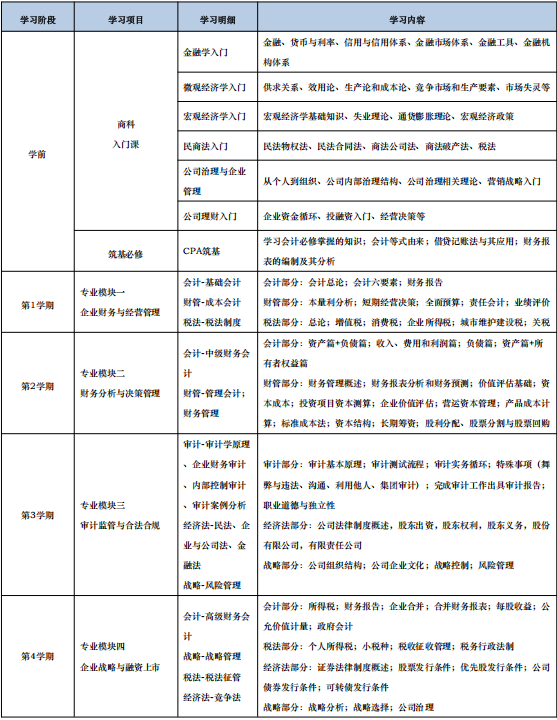 CPA实验班在提供CPA专业知识教学的基础上,同步提供多元化实践项目,理论与实践相结合,依托四模块理论基础,设计四个不同从业方向的实践应用项目。学生通过实践应用,引导学生了解财经领域的职场规范和行业动态,提高学生职业素养和竞争力。