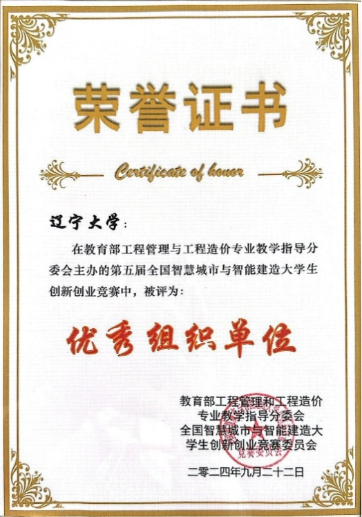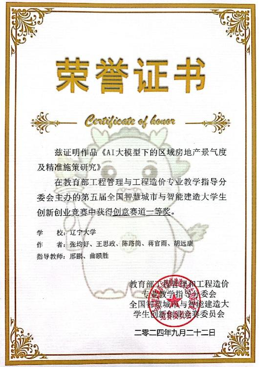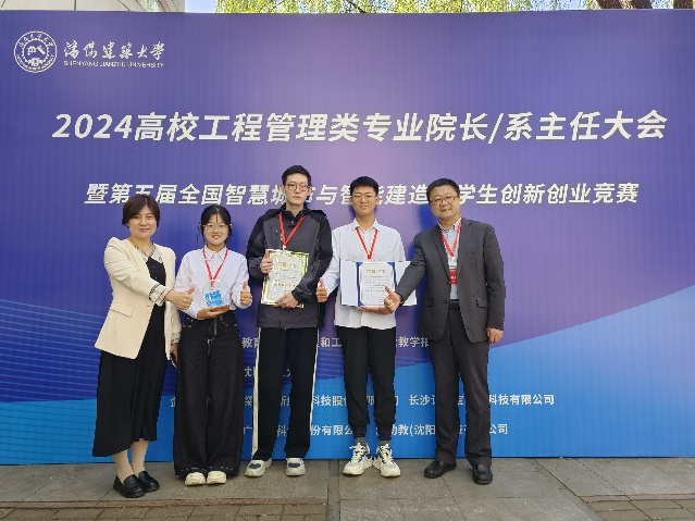 2024年9月21日至22日,由教育部工程管理和工程造价专业教学指导分委员会主办的第五届全国智慧城市与智能建造大学生创新创业竞赛在沈阳建筑大学举行。yl6809永利邢鹏老师和系主任曲赜胜老师共同指导的,由工程管理专业(张均好、王思政、陈路简)及管理科学与工程专业(胡远康、蒋官雨)五位同学组成的代表队,以真实问题为导向,撰写的《AI大模型下的区域房地产景气度及精准施策研究》作品,经过多轮的专家网上函评和线下答辩,从全国38所高校近50支精英队伍中脱颖而出,继2019年斩获首届比赛全国一等奖后,永利官网代表队再次勇夺全国一等奖。同时永利官网还被授予“优秀组织单位”奖。