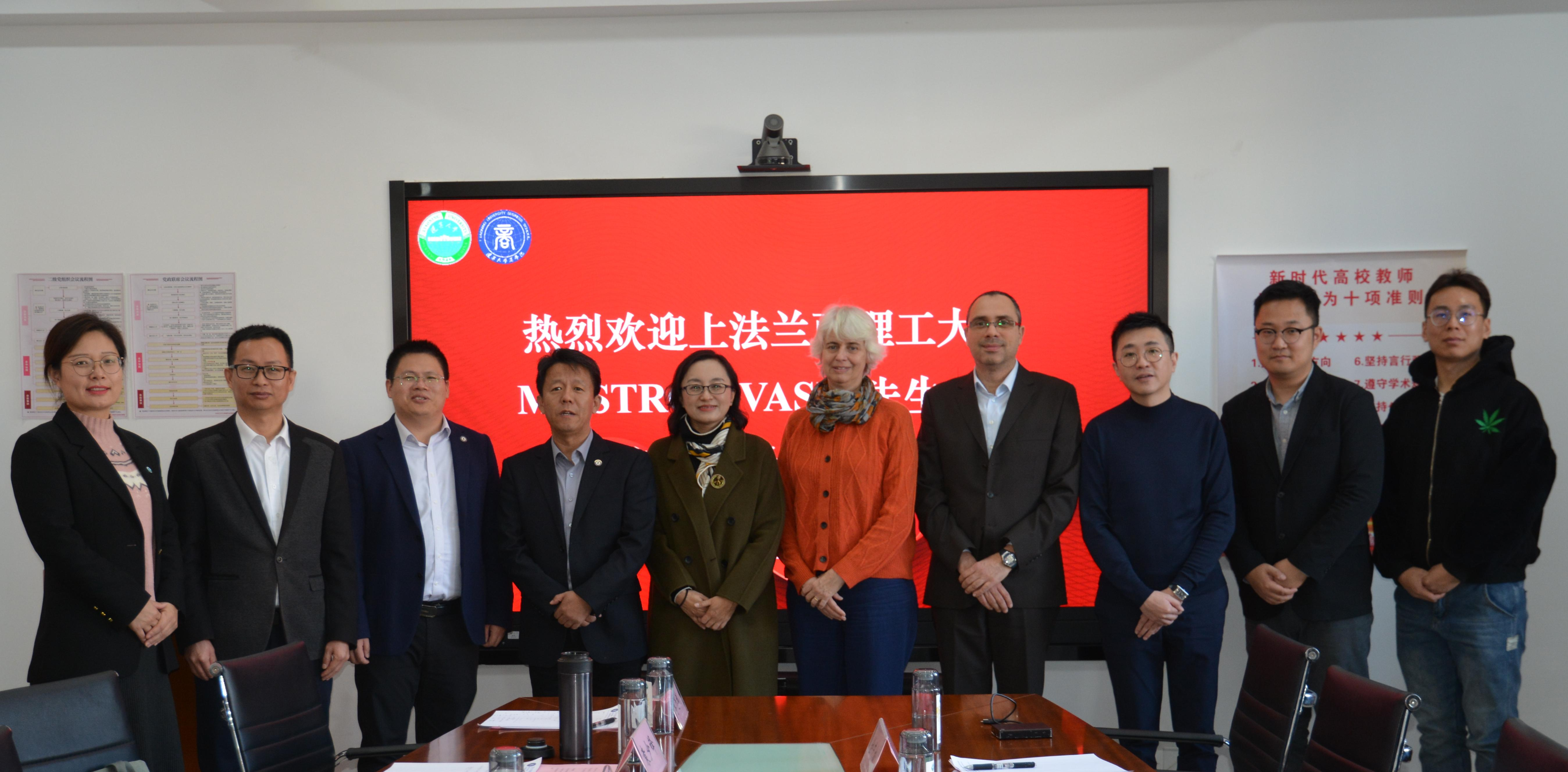 115日上午,上法兰西理工大学代表团到访yl6809永利检测中心,双方就人才培养国际合作项目展开洽谈。上法兰西理工大学文学、艺术、人文专业教学负责人瓦兹乐·莫斯托夫先生(MOSTROV VASIL),人文学部、企业管理学院外事负责人维宏妮可·萨基妮蒂女士(VÉRONIQUE SANGUINETTI),合作事务负责人(中国)于辛陶先生,项目协调员(中国)全艺松先生,永利官网永利集团处处长谢名一、yl6809永利党委书记李玉华、副院长徐业坤、永利集团办公室主任袁少锋、学院办公室主任李岩参加洽谈。会议由yl6809永利党委书记李玉华主持。