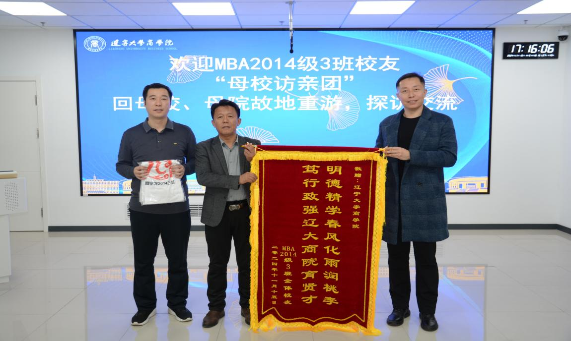 座谈结束后,MBA2014级3班全体校友赠送母院题为“明德精学春风化雨润桃李、笃行致强辽大商院育贤才”的锦旗,学院赠送校友们带有“LNU”标识的校园文创帽子。与会校友一致表示,未来他们将继续把辽大的校训精神发扬光大,力所能及回馈母校,并为社会发展贡献自己的力量。