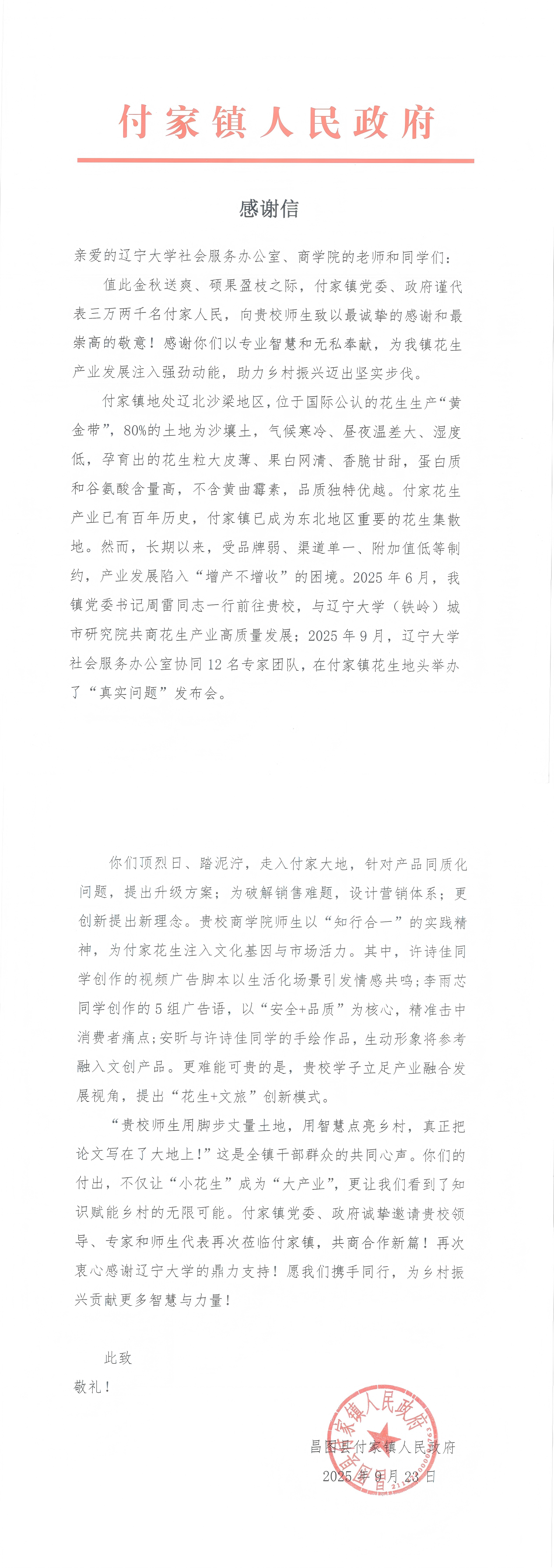 9月23日,昌图县付家镇人民政府向yl6809永利检测中心师生发来感谢信,信中对永利官网社会服务办公室以及yl6809永利师生表达了诚挚谢意。