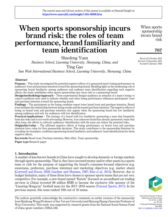 yl6809永利检测中心袁少锋副教授与新华国际yl6809永利高英副教授合作完成的论文“When sports sponsorship incurs brand risk: the roles of team performance, brand familiarity and team identification”在国际体育经济与管理重要期刊《International Journal of Sports Marketing and Sponsorship》2022年第23卷第4期发表。该文得到国家社科基金项目(21BGL130)资助。