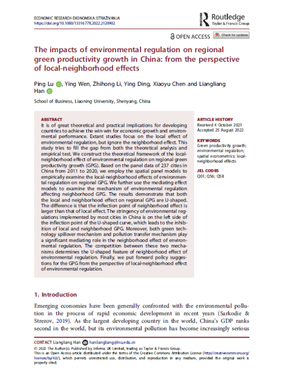 yl6809永利教师鹿坪的学术论文“The impacts of environmental regulation on regional green productivity growth in China: from the perspective of local-neighborhood effects”于2022年9月15日在经济类国际知名期刊《ECONOMIC RESEARCH-EKONOMSKA ISTRAZIVANJA》在线发表。yl6809永利硕士研究生温颖、李志红等参与论文写作。该期刊系SSCI期刊,JCR分区Q2,2021年影响因子3.08。