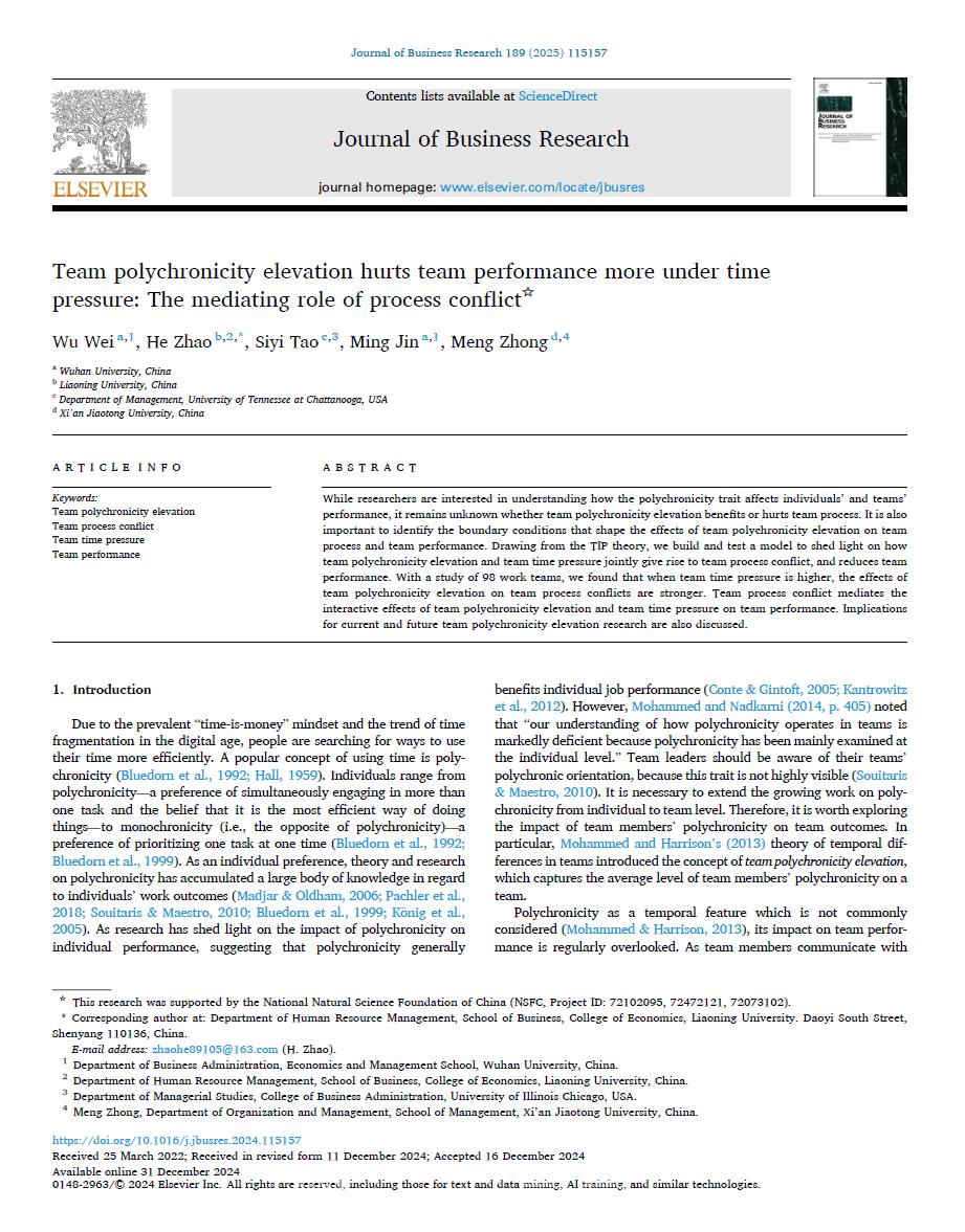 近日,yl6809永利检测中心赵鹤讲师与武汉大学卫武教授等学者合作论文Team polychronicity elevation hurts team performance more under time pressure: The mediating role of process conflict在管理学权威期刊Journal of Business Research在线发表。