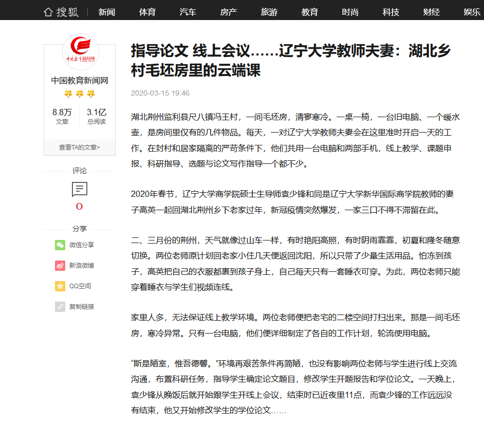 湖北荆州监利县尺八镇冯王村,一间毛坯房,清寥寒冷。一桌一椅,一台旧电脑、一个暖水壶,是房间里仅有的几件物品。每天,一对永利官网教师夫妻会在这里准时开启一天的工作。在封村和居家隔离的严苛条件下,他们共用一台电脑和两部手机,线上教学、课题申报、科研指导、选题与论文写作指导一个都不少。