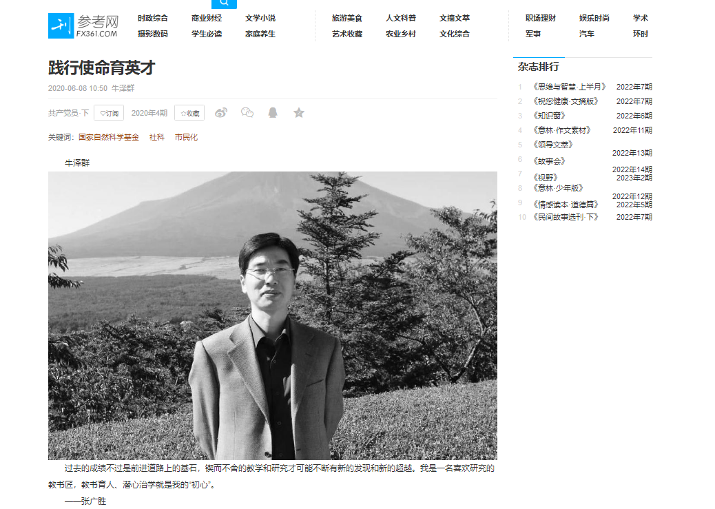 生活中许多微小中藏有博大,工作中几许坚持下终结硕果。一个个头衔、一项项荣誉勾勒出张广胜教书育人、潜心治学的闪光足迹:国家百千万人才工程国家级人选,国家有突出贡献中青年专家,国务院政府特殊津贴获得者,教育部新世纪优秀人才,“兴辽英才计划”哲学社会科学领军人才,辽宁省优秀专家,沈阳市十大杰出青年(荣获五四奖章)……张广胜却谦虚地说:“过去的成绩不过是前进道路上的基石,锲而不舍的教学和研究才可能不断有新的发现和新的超越。”