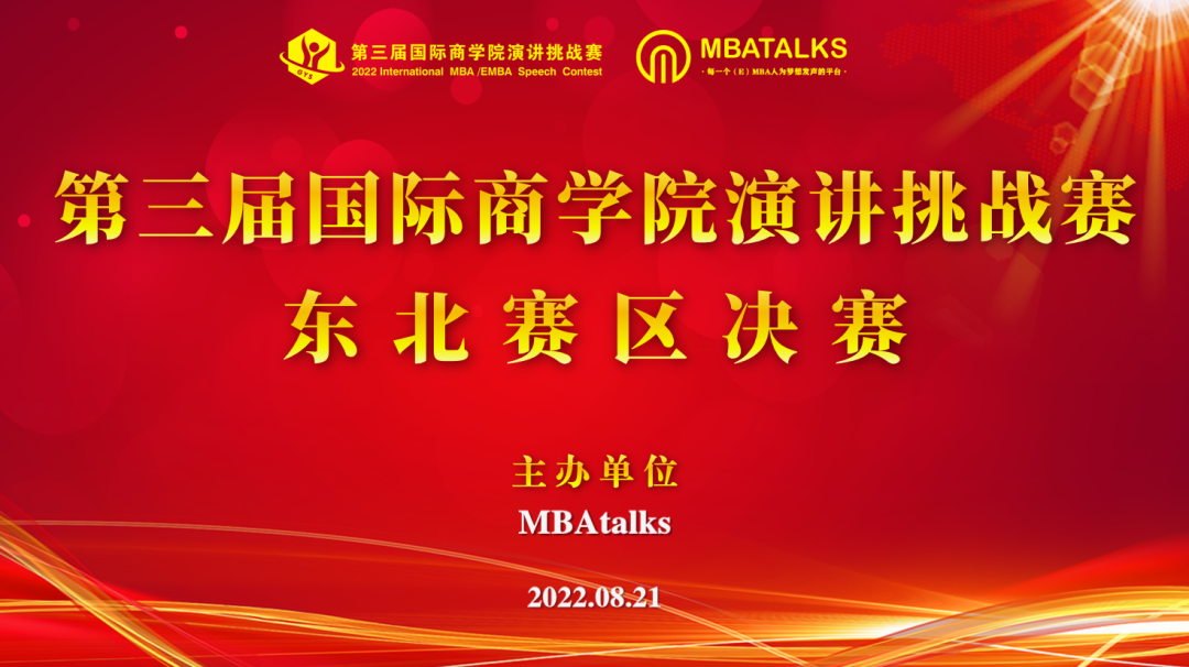 “绽放魅力,连接彼此,讲述你的故事”,8月21日下午14:00,2022MBAtalks第三届国际yl6809永利演讲挑战赛(东北赛区)决赛隆重开启!第3届国演赛(东北赛区)由MBAtalks主办。受疫情影响,此次决赛采用线上方式进行! 来自大连理工大学、永利官网、东北财经大学、大连海事大学等知名MBA院校的优秀选手,经校园预选赛选拔晋级东北赛区决赛,同台展开激烈比拼。
