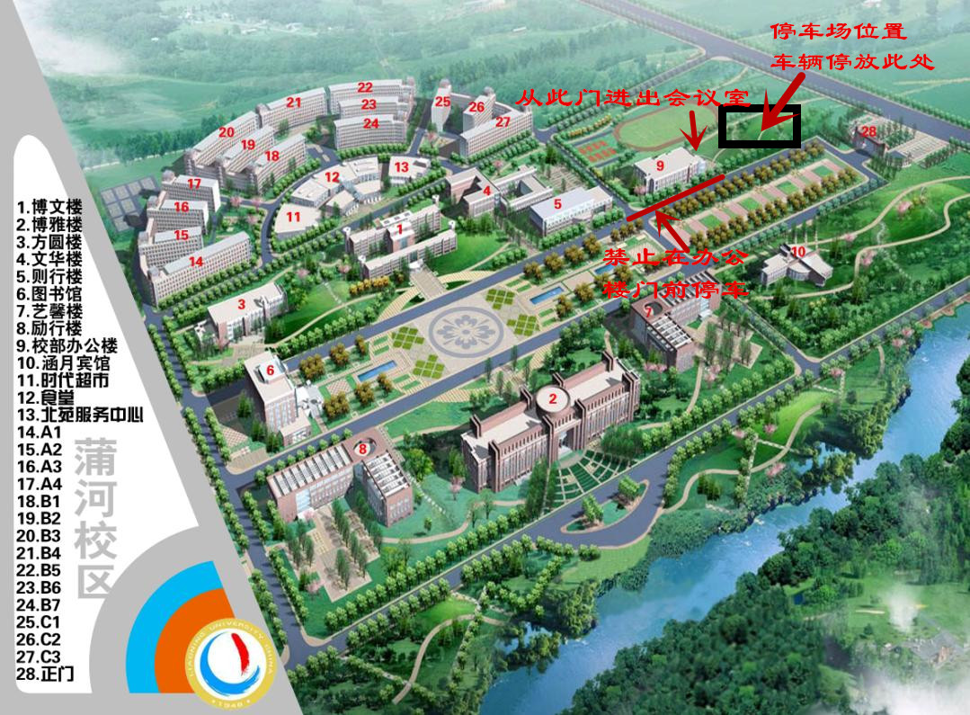 请由校部办公楼东面的侧门(侧门位于办公楼东侧的外楼梯下方)进入会议室;开车前往的同学,请将车辆停在距离办公楼东侧约50米的停车场,勿将车辆停在办公楼前的马路上,切不可随意停放,从而影响学校内的基本秩序。具体方位详见附件。